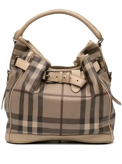 This shoulder bag features a coated canvas body with leather trim, a rolled leather strap, an open top, an interior zip compartment, and an interior zip pocket. Brown. Serial Number: CNDONHOUDON. This item has no inclusions. Condition: GOOD. This previously owned and used item is in good condition with minimal signs of use. This may include fading of material or plating and scratches. Please refer to the photos on this product page for a detailed view of the item, including any damages declared.