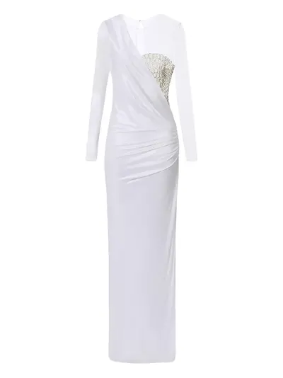 ivory tulle detail jersey texture crocodile-effect embroideries draped detail long sleeves side slit