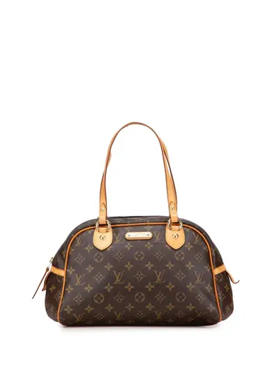 monogram canvas body with vachetta leather trim flat vachetta leather handles top zip closure interior slip pocket brown Serial Number: SP2048 This item has no inclusions. Condition: GOOD. This previously owned and used item is in good condition with minimal signs of use. This may include fading of material or plating and scratches. Please refer to the photos on this product page for a detailed view of the item, including any damages declared.