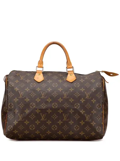 The Speedy 35 features a monogram canvas body with vachetta leather trim, rolled vachetta leather handles, a top zip closure, and an interior slip pocket. Brown. Serial Number: SP1909. This item has no inclusions. Condition: GOOD. This previously owned and used item is in good condition with minimal signs of use. This may include fading of material or plating and scratches. Declared Damages: Handle/Strap Feature(s) Moderate Water Mark. Exterior Side Feature(s) Moderate Water Mark. Please refer to the photos on this product page for a detailed view of the item, including any damages declared.