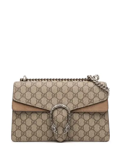 The Dionysus features a coated canvas body with suede leather trim, a silver-tone curb chain shoulder strap, a front flap with push lock closure, and an interior zip compartment. Brown. Serial Number: 400249 486628. This item has no inclusions. Condition: EXCELLENT. This previously owned item is in near-perfect condition with no signs of damage or use. Please refer to the photos on this product page for a detailed view of the item, including any damages declared.