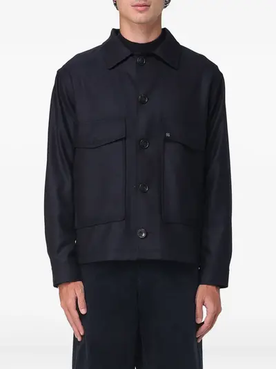 dark blue button fastening two chest pockets point collar long sleeves straight hem