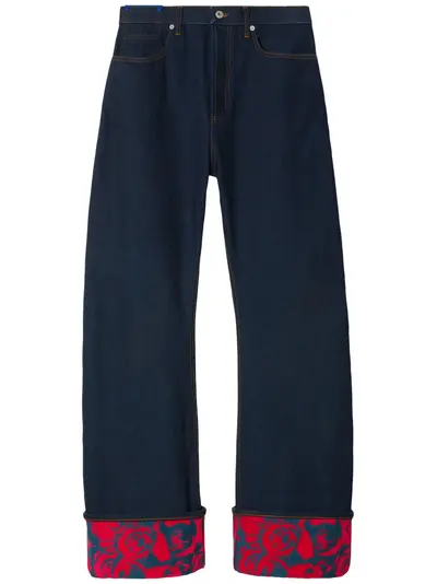 indigo blue cotton denim appliqué logo high-rise belt loops concealed fly and button fastening classic five pockets straight leg turn-up cuffs