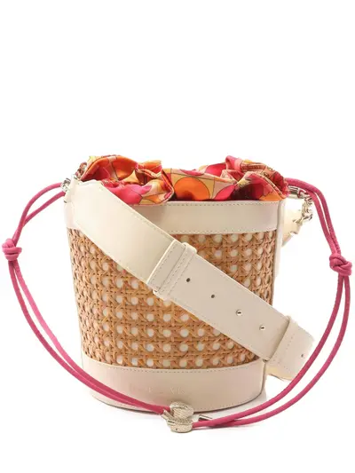 wicker body with leather trim rolled leather handles detachable and adjustable flat leather strap open top removable satin insert brown This item has no inclusions. Condition: EXCELLENT. This previously owned item is in near-perfect condition with no signs of damage or use. Due to the exclusivity of this item and its limited availability, processing and delivery might take longer than usual. Please refer to the photos on this product page for a detailed view of the item, including any damages declared.