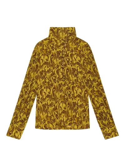 yellow-gold floral print high neck button fastening long sleeves cuffed sleeves