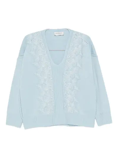 light blue floral embellishment v-neck long sleeves ribbed cuffs and hem