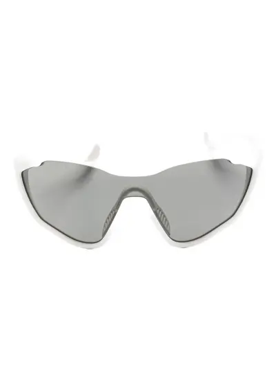 white shield frame tinted lenses curved tips logo detail These glasses come with a protective case.