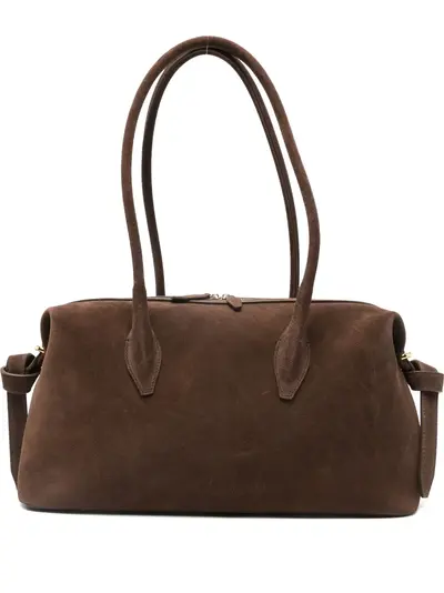 chocolate brown two top handles top zip fastening knotted detail gold-tone hardware rectangular shape