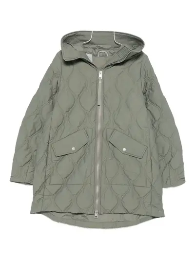 sage green quilted hooded front zip fastening two front flap pockets long sleeves