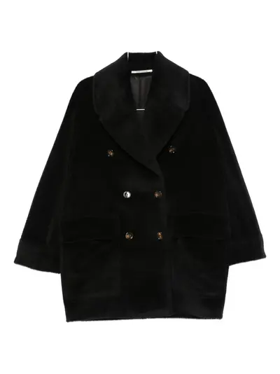 black double-breasted front button fastening notched lapels front patch pockets long sleeves