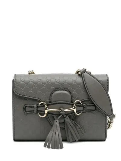 embossed leather body gold-tone curb chain link leather shoulder strap with leather guard front flap with a slip through closure tassel detail interior slip pocket gray Serial Number: 449636 493075 This item has no inclusions. Condition: EXCELLENT. This previously owned item is in near-perfect condition with no signs of damage or use. Please refer to the photos on this product page for a detailed view of the item, including any damages declared.