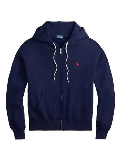 navy blue zip fastening long sleeves drawstring hood embroidered logo
