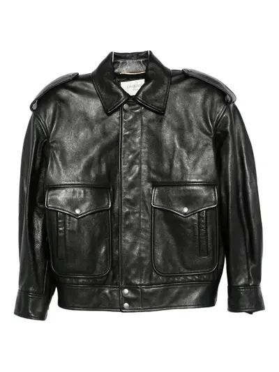 black calf leather flap pockets point collar press stud fastening long sleeves