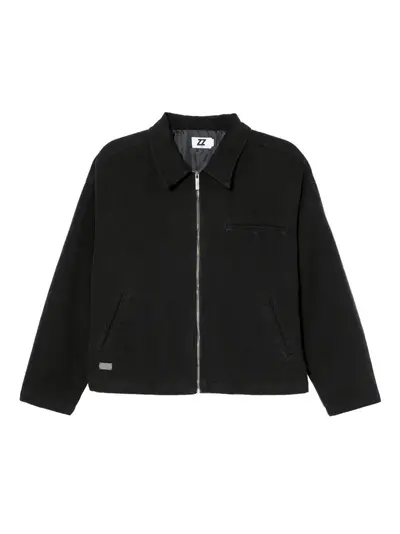 dark blue front zip fastening chest jetted pocket two side jetted pockets long sleeves