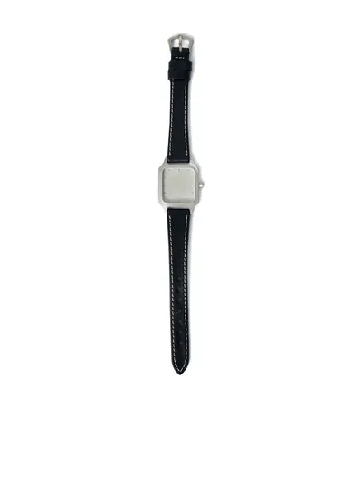 silver/black leather strap rectangle face rear logo motif no working clock buckle fastening