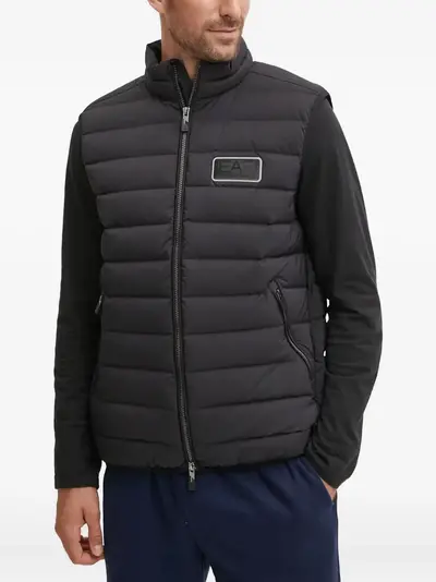 black zip fastening logo patch stand-up collar side zip pockets quilted design