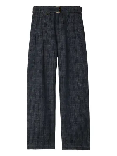 indigo blue concealed front button, hook and zip fastening two side slit pockets rear welt pocket signature Equestrian Knight motif