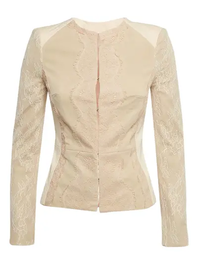beige lace paneling lace sleeves fitted silhouette front closure Condition: GOOD. This previously owned and used item is in good condition with minimal signs of use. This may include fading of material or plating and scratches.