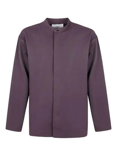 purple button fastening long sleeves band collar tonal stitching straight hem