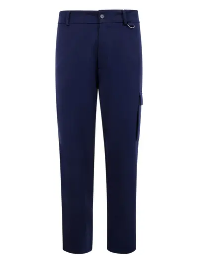 dark blue side cargo pocket rear flap pockets belt loops button fastening ring detail