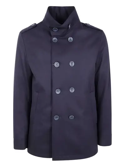 navy blue double-breasted button fastening high neck shoulder epaulettes welt pockets