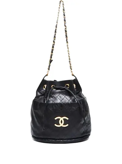 1989-1991 black lambskin gold-tone hardware drawstring fastening chain strap logo plaque Condition: GOOD. This previously owned and used item is in good condition with minimal signs of use. This may include fading of material or plating and scratches.