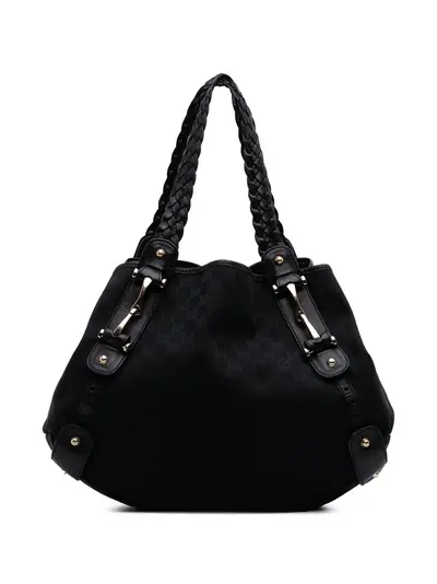 The Pelham shoulder bag features a canvas body with leather trim, braided leather handles, an open top, and an interior zip pocket. Black. Serial Number: 137621 205011. This item has no inclusions. Condition: GOOD. This previously owned and used item is in good condition with minimal signs of use. This may include fading of material or plating and scratches. Please refer to the photos on this product page for a detailed view of the item, including any damages declared.