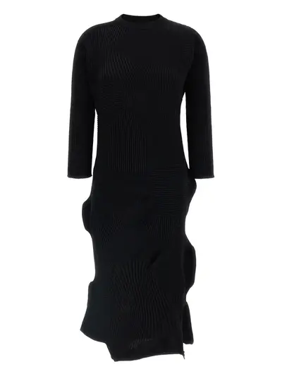 black seamless pleated fabric round neckline long sleeves asymmetrical hem