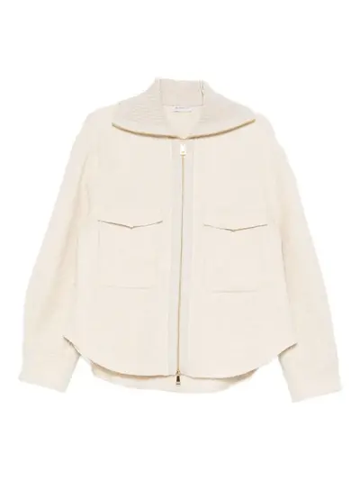beige bouclé construction front zip fastening spread collar two chest patch pockets long sleeves