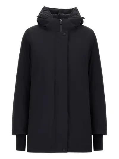 black hooded neckline snap button fastening concealed zip fastening long sleeves