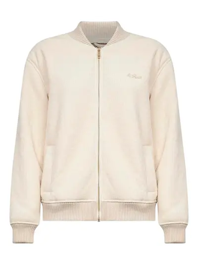 cream ribbed knit bomber collar chest embroidery side welt pockets ribbed knit cuffs ribbed knit bottom band