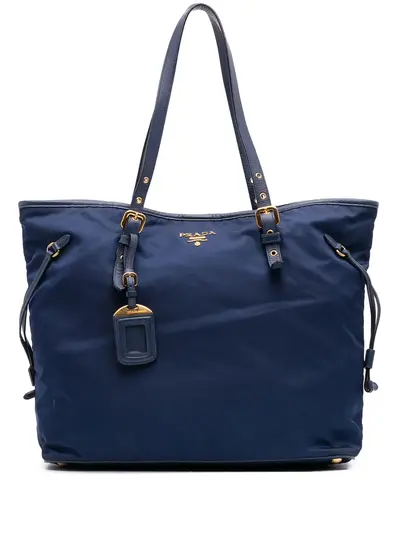 This tote bag features a nylon body with leather trim, flat leather handles, an open top with drawstring and magnetic snap closure, and an interior zip pocket. Blue. Inclusions: name tag. Condition: GOOD. This previously owned and used item is in good condition with minimal signs of use. This may include fading of material or plating and scratches. Declared Damages: Interior Pocket Feature(s) Minor Loose Stitching. Please refer to the photos on this product page for a detailed view of the item, including any damages declared.