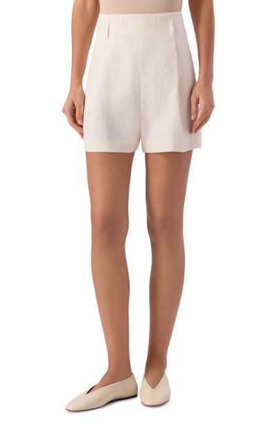 Шорты с высокой посадкой и защипами выполнили из чистого льна. Помимо боковых карманов предусмотрели задние с листочками. Модель со шлевками на цельнокроеном поясе застегивается потайной молнией сзади.