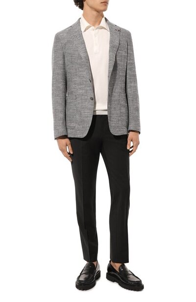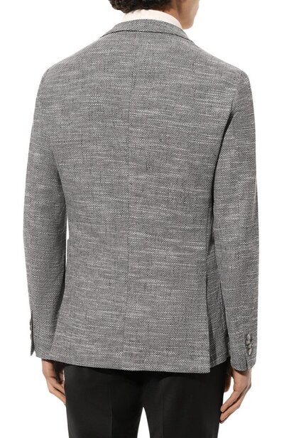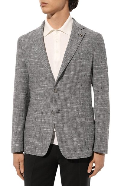 Легкая конструкция с мягкой линией плеч и отсутствие подклада делают этот меланжево серый пиджак почти таким же комфортным, как кардиган. Он идеально садится по фигуре и легко подстраивается под движения. Модель с прямоугольными лацканами сшили из дышащей ткани с фактурным микроузором, полученным переплетением разных по толщине волокон нежного хлопка, шелковистой вискозы и тонкого льна.