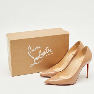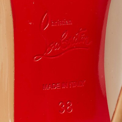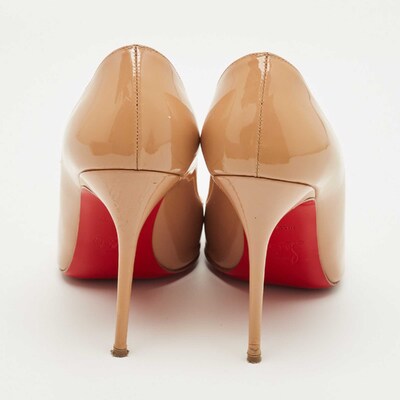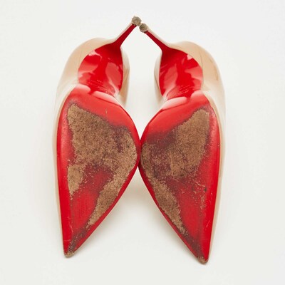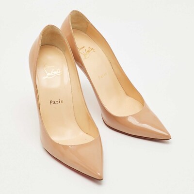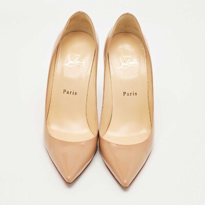 Step into timeless elegance with these Christian Louboutin Decollete pumps crafted from glossy beige patent leather. Designed with a sleek pointed toe and slim heel, they flatter the foot beautifully. Finished with the signature red sole, they transition seamlessly from workwear to evening chic.