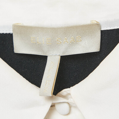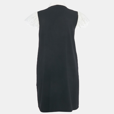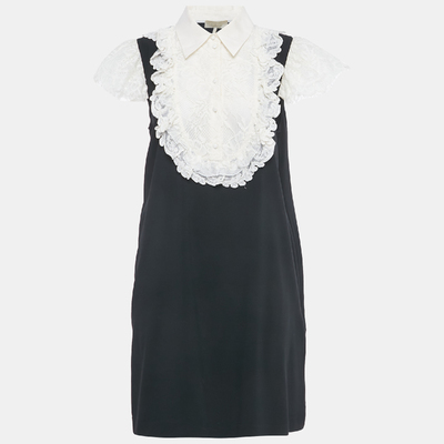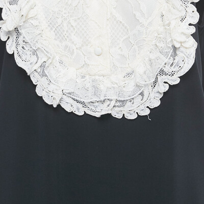 Almost like two stories woven into one, this Elie Saab mini dress pairs crisp black crepe with delicate white lace. The collared front and ruffled bib give it an almost Victorian air with a modern twist, while the lace sleeves keep it light and unexpected.