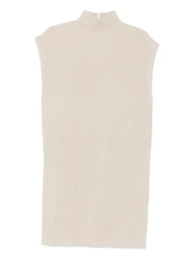 beige ribbed knit high neck sleeveless rear zip fastening straight hem