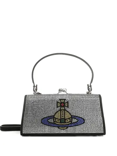 silver orb motif top handle detachable shoulder strap kiss-lock closure embellishments