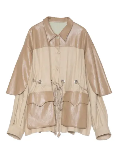 beige organic linen faux-leather panels button fastening drawstring waist flap pockets