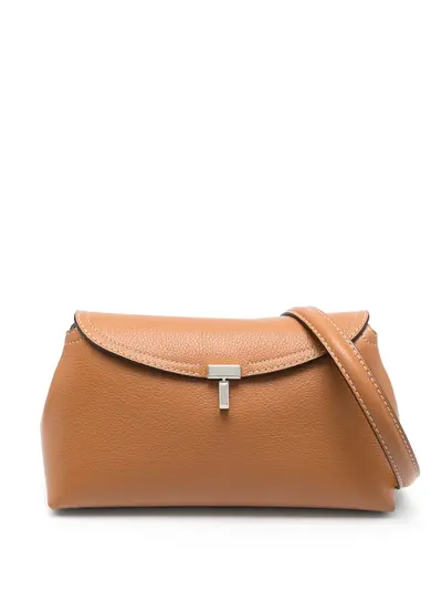 tan brown calf leather grained texture T-Lock fastening logo stamp to the front adjustable detachable shoulder strap foldover top main compartment internal logo patch