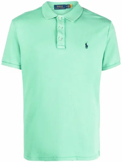 pale green cotton signature Polo Pony motif polo collar front button placket short sleeves ribbed cuffs side slits straight hem