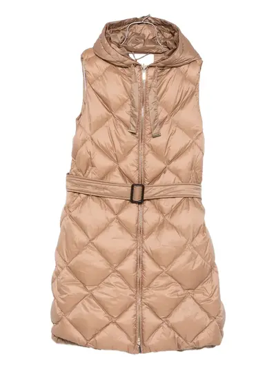 almond beige quilted drawstring hooded belted waist zip fastening sleeveless