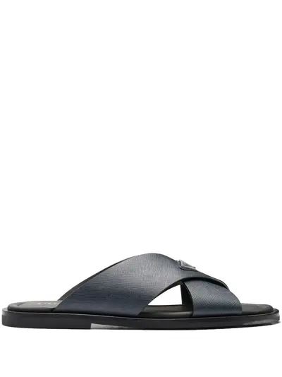 navy blue Saffiano leather enamel triangle logo crossover strap at the toe open toe slip-on style branded leather insole flat rubber sole