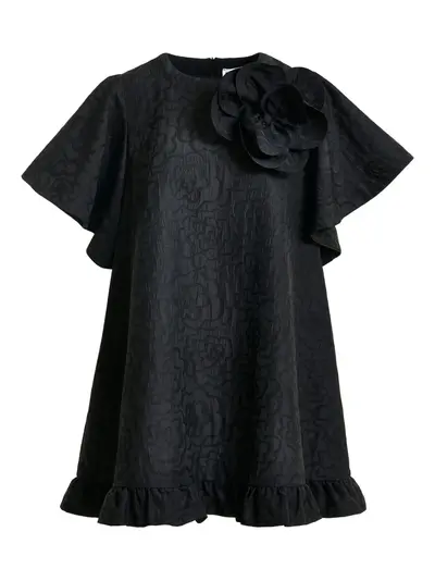 black tonal pattern flower brooch flounced hemline side slit pockets