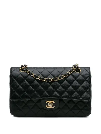 quilted caviar leather body leather woven chain straps double front flaps with interlocking Cs twist lock closure exterior back slip pocket interior zip and slip pockets black Serial Number: 12964147 This item has no inclusions. Condition: GOOD. This previously owned and used item is in good condition with minimal signs of use. This may include fading of material or plating and scratches. Declared Damages: Exterior Side Feature(s) Minor Loose Stitching. Please refer to the photos on this product page for a detailed view of the item, including any damages declared.