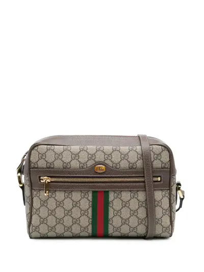 coated canvas body with leather trim adjustable flat leather strap top zip closure exterior zip pocket interior zip pocket brown Serial Number: 517080 001998 This item has no inclusions. Condition: EXCELLENT. This previously owned item is in near-perfect condition with no signs of damage or use. Please refer to the photos on this product page for a detailed view of the item, including any damages declared.