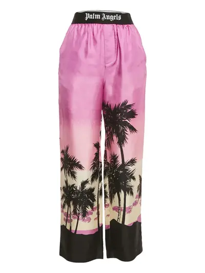 pink satin palm tree print gradient sunset effect wide leg elastic waistband Condition: FAIR. This previously owned and used item is in fair condition with visible signs of use. This may include fading of material or plating, loose stitches, discolouration, patina or heavy scratches.