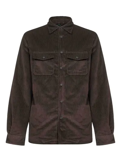 dark brown shirt collar snap buttoned cuffs chest pockets side pockets embroidered logo