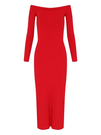 cardinal red off-shoulder neckline long sleeves ribbed texture midi length
