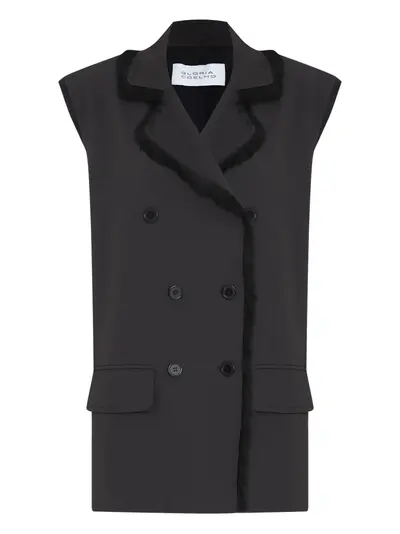 black double-breasted fastening frayed trim sleeveless notched collar straight hem